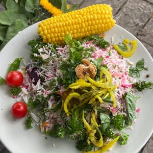 Seasonal salad leaves tossed with kalamata olives, cucumber, tomato, red onion, Greek feta and herbs with a cider and perry vinegar dressing and extra virgin olive oil dressing