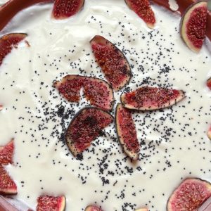Homemade toasted sesame granola and Greek (or coconut) yogurt topped with seasonal fruits, honey and tahini